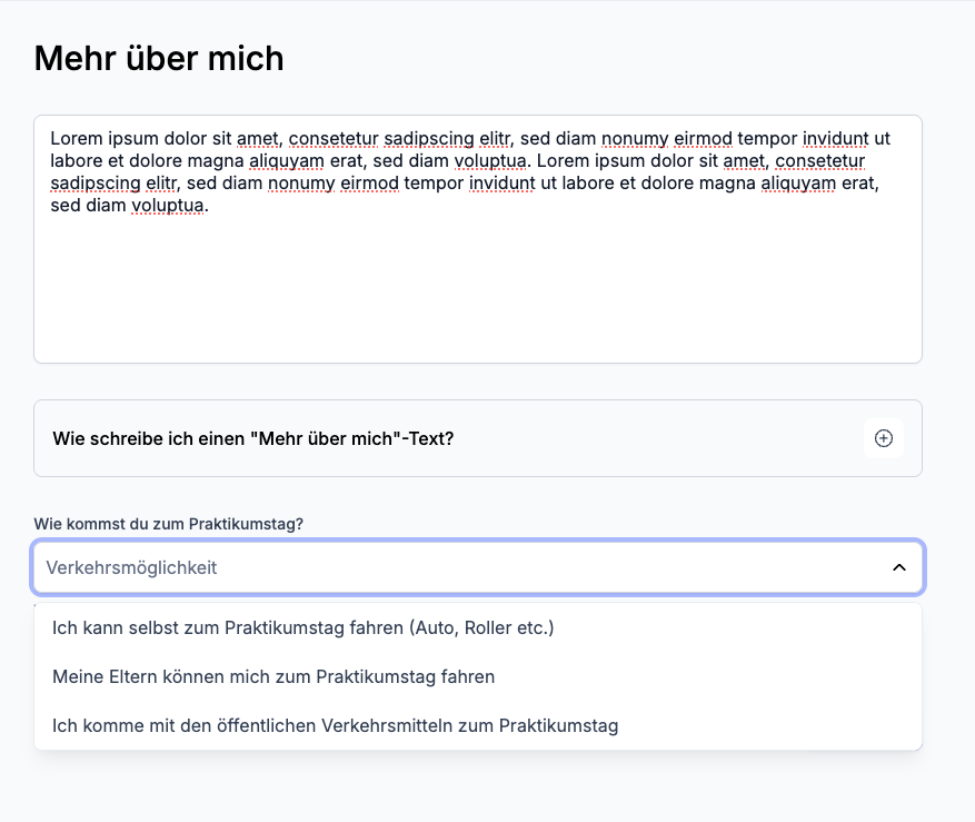 Die Plattform prüft automatisch, ob eine Anreise zum Praktikumstag realistisch ist. Dafür werden die Praktikant:innen gefragt, wie sie anreisen können. Das System berechnet im Hintergrund die Fahrzeit zur jeweiligen Praktikumsstelle. Nur Stellen, die innerhalb eines angemessenen Zeitfensters erreichbar sind, fließen in die Vermittlung ein.