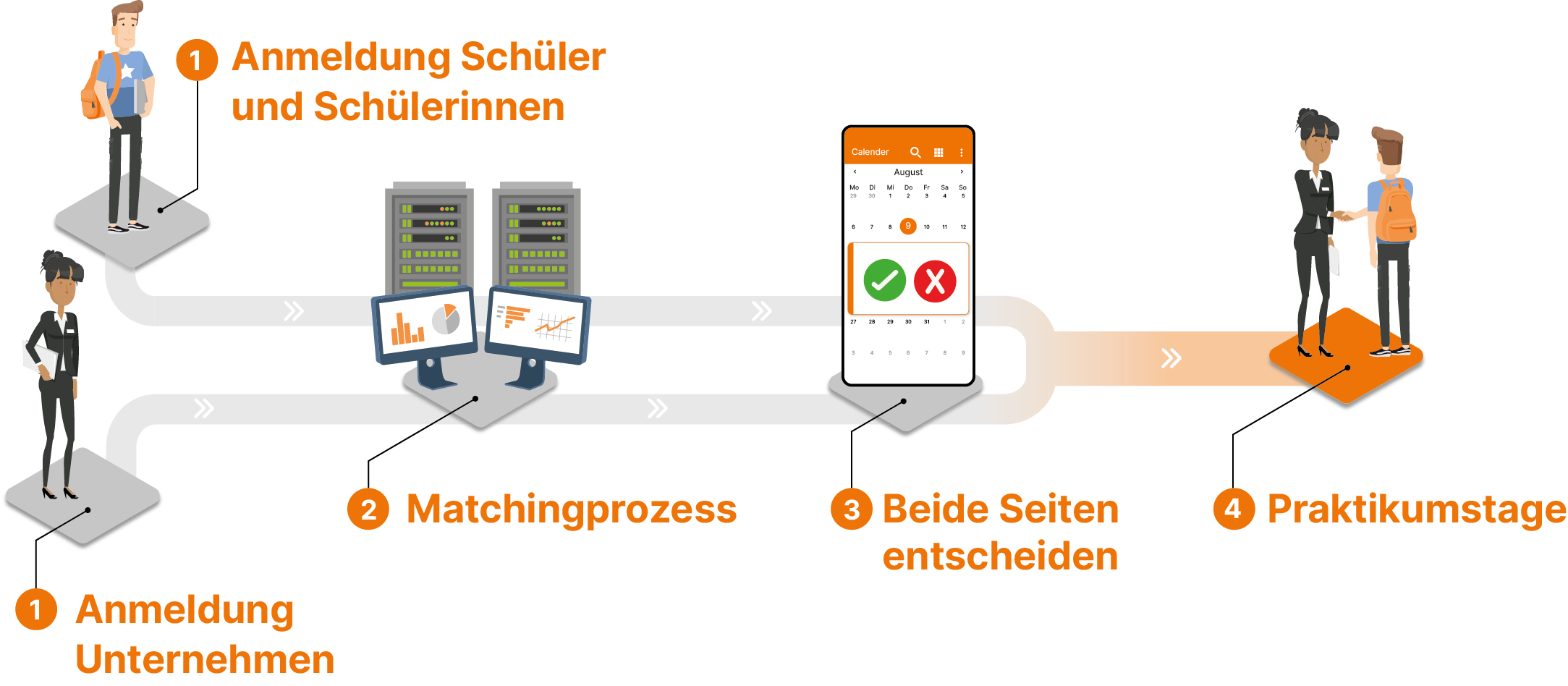 Die Plattform vermittelt automatisch Talente und plant Praktikumstage. Sie sagen Praktikumstage zu oder ab.